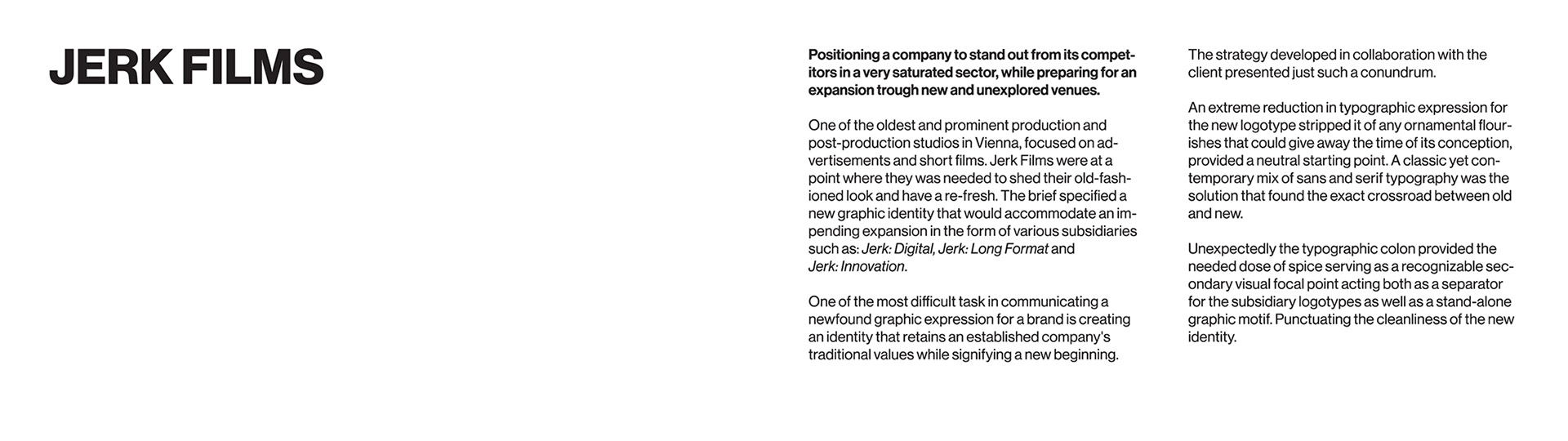 Positioning a company to stand out from its competitors in a very saturated sector, while preparing for an expansion trough new and unexplored venues. One of the oldest and prominent production and post-production studios in Vienna, focused on advertisements and short films. Jerk Films were at a point where they was needed to shed their old-fashioned look and have a re-fresh. The brief specified a new graphic identity that would accommodate an impending expansion in the form of various subsidiaries such as: Jerk: Digital, Jerk: Long Format and Jerk: Innovation. One of the most difficult task in communicating a newfound graphic expression for a brand is creating an identity that retains an established company's traditional values while signifying a new beginning. The strategy developed in collaboration with the client presented just such a conundrum.